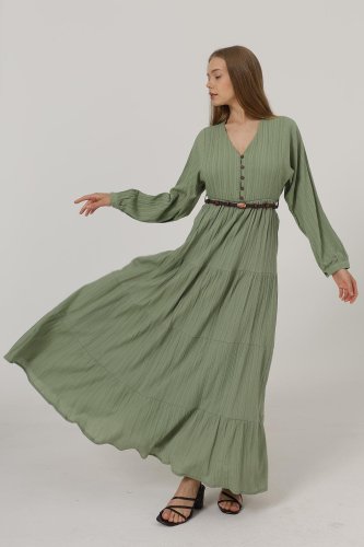 Önü Yarım Düğmeli Uzun Kol Kemerli Elbise Haki